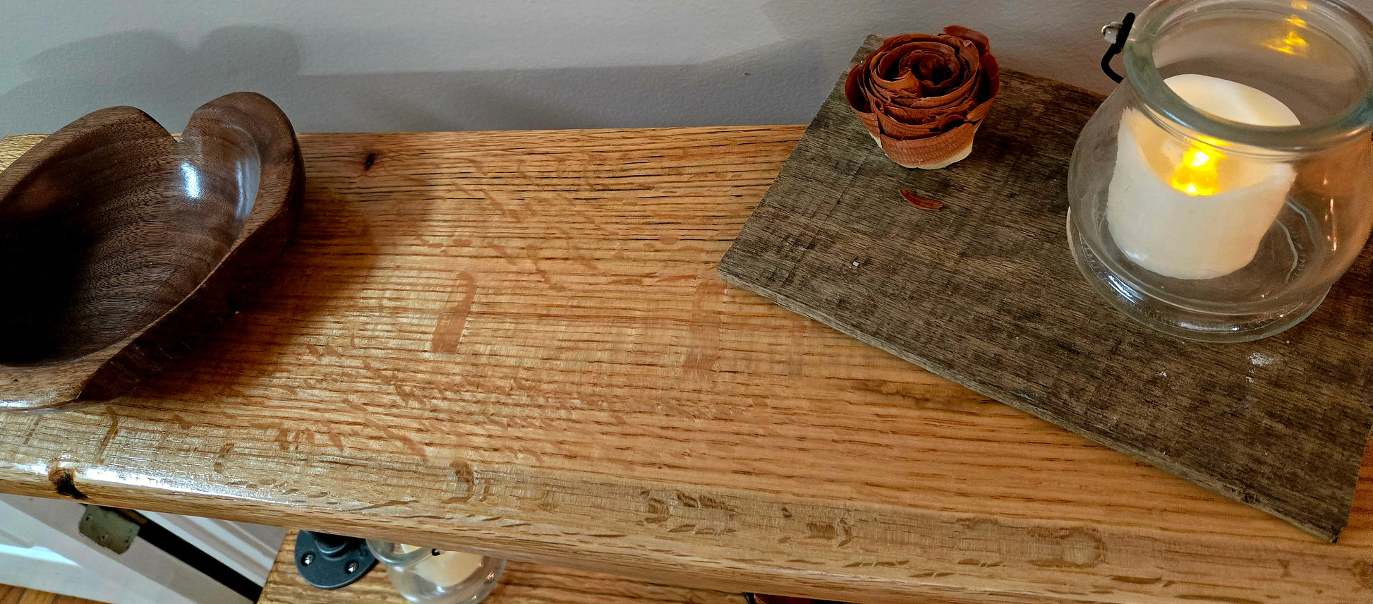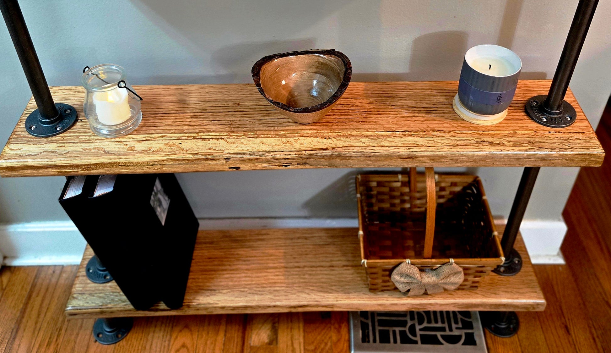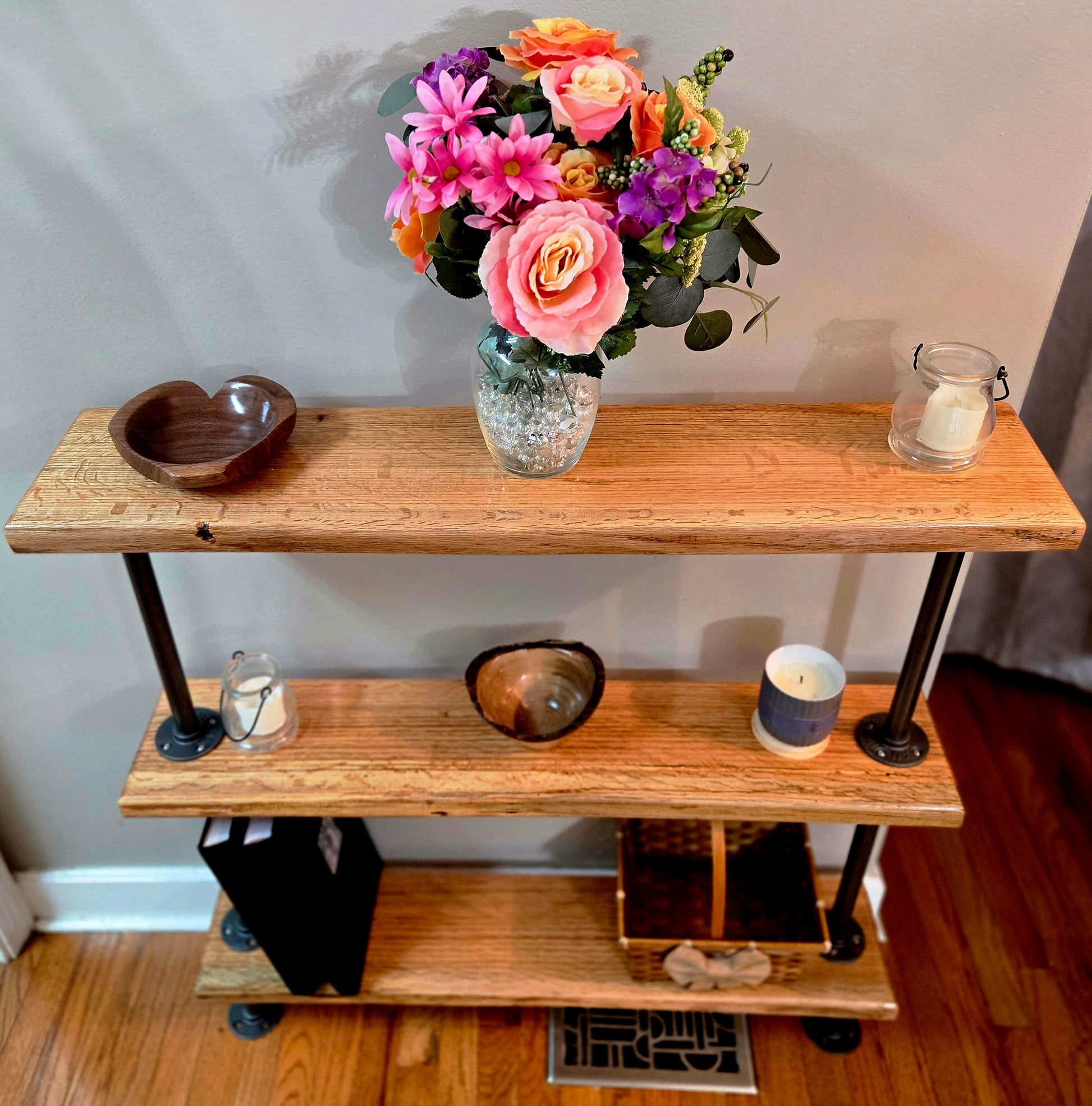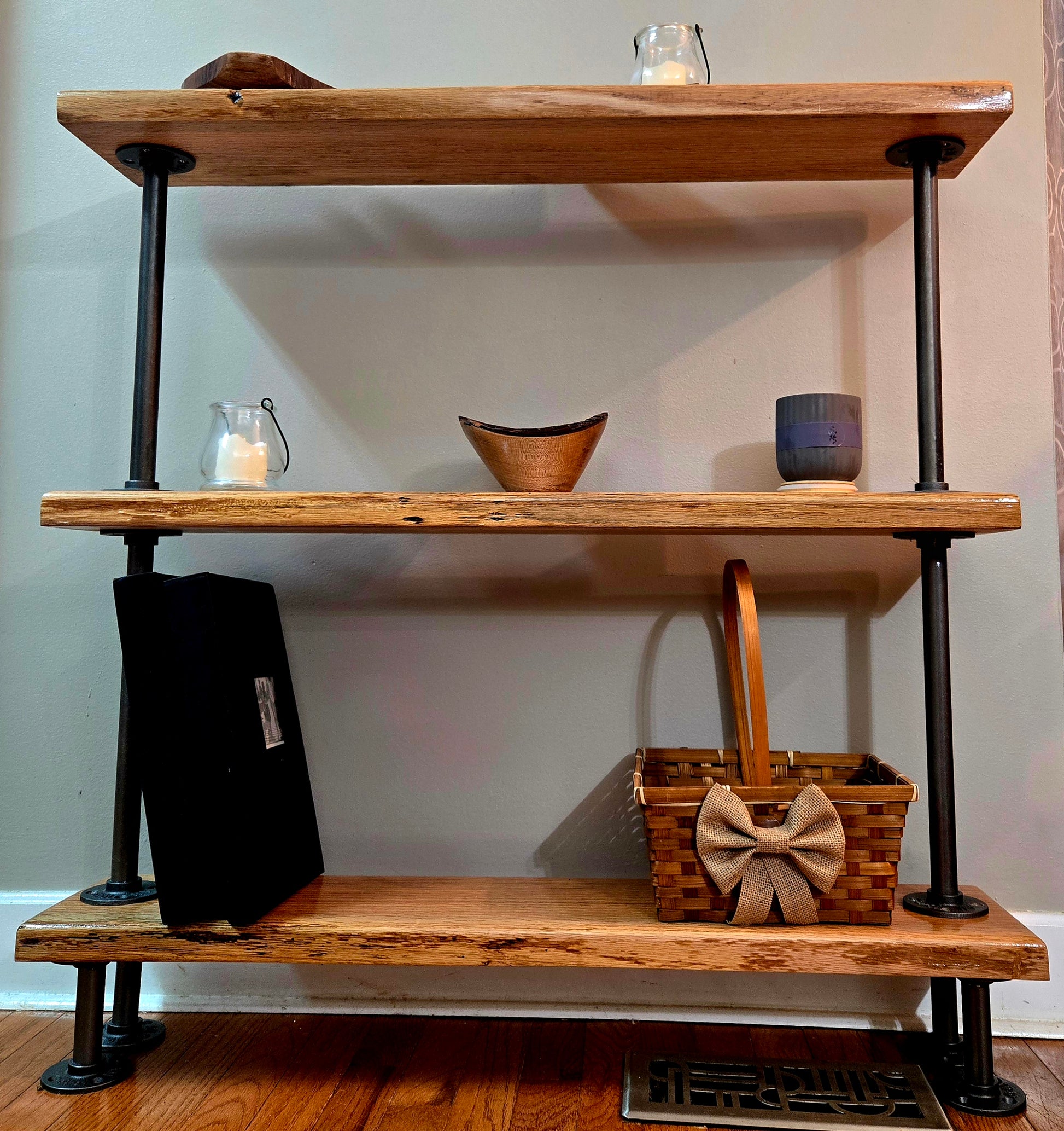 Stunning handmade red oak shelf! Perfect for your entryway, hallway, or display. Crafted from locally salvaged red oak, this beauty measures 37"x38"x7.5". Add rustic charm to your space!