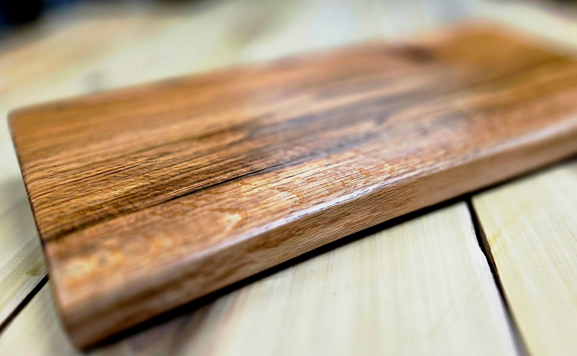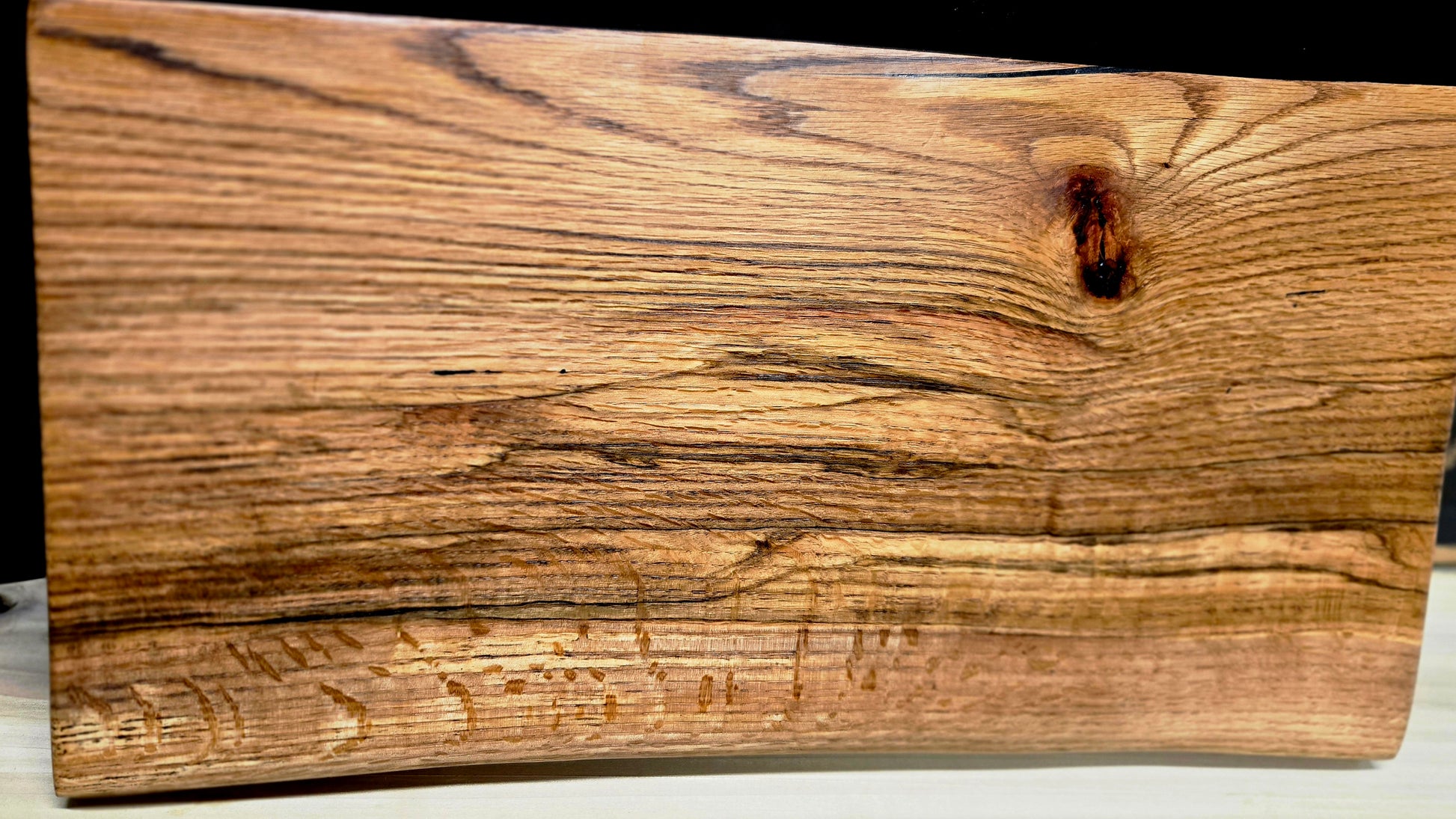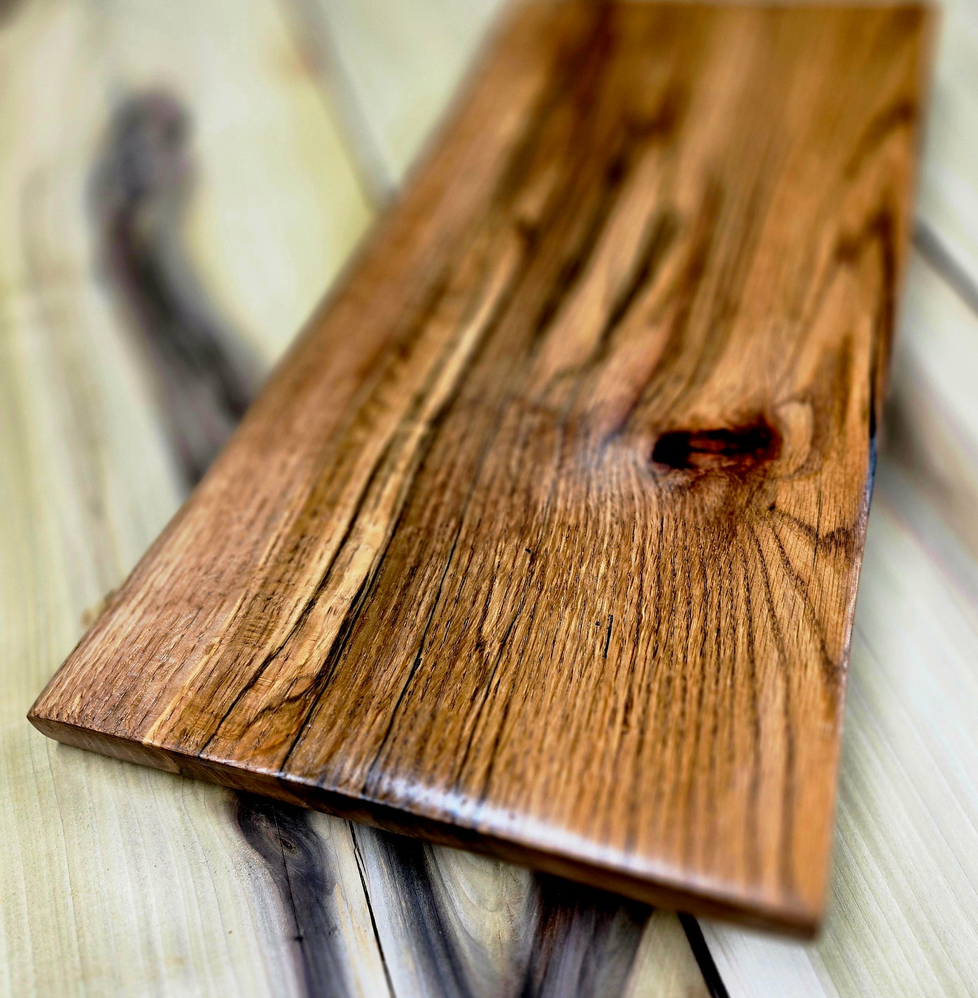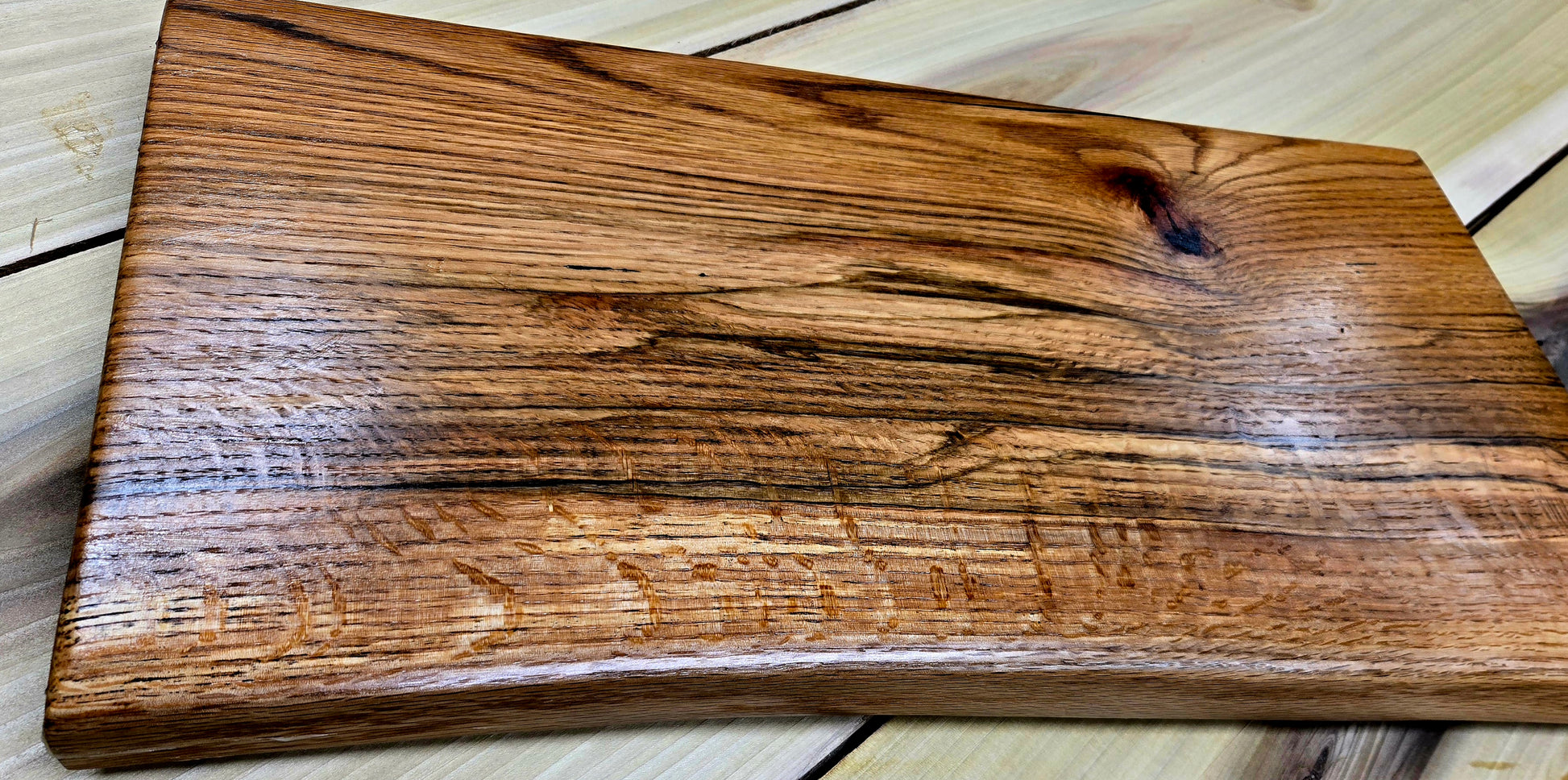 Let the flow and colorful grain of this red oak cutting board speak for itself. From dark red to light in color, this board shimmers in the light. Finished with all natural food safe oils and wax. Elevating legs so not to trap moisture. Great size for large meal prep or presentation 21"x 11". Includes care instructions.