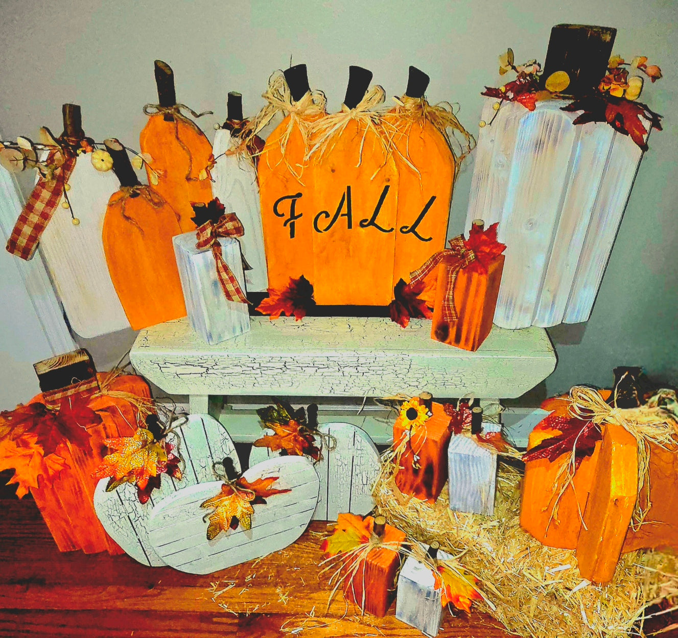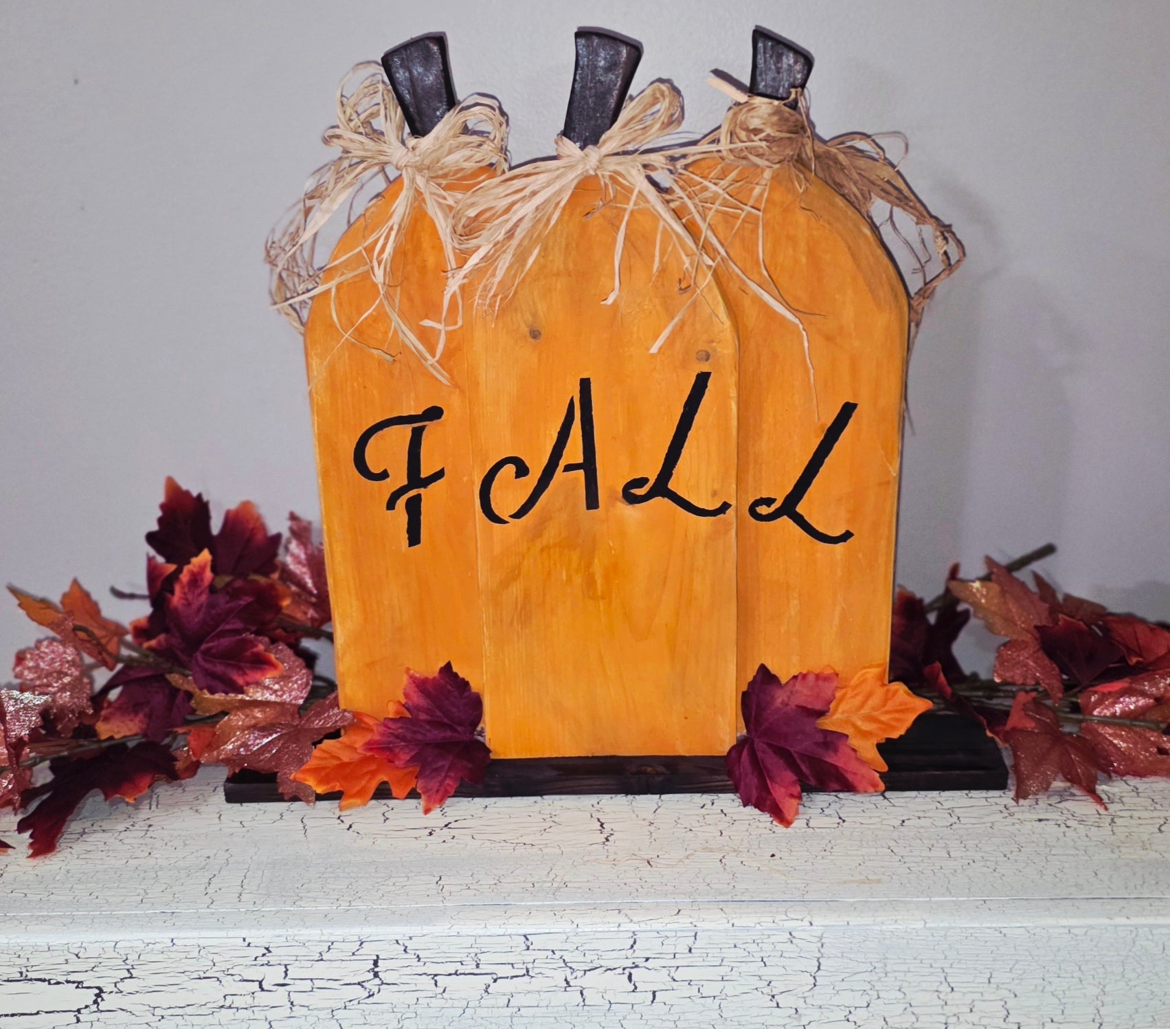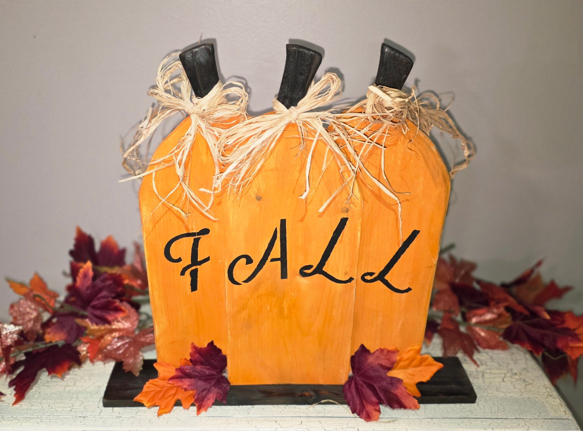 Fall in love with these rustic hand crafted pumpkins. Free standing on finished cedar. 16"x17".