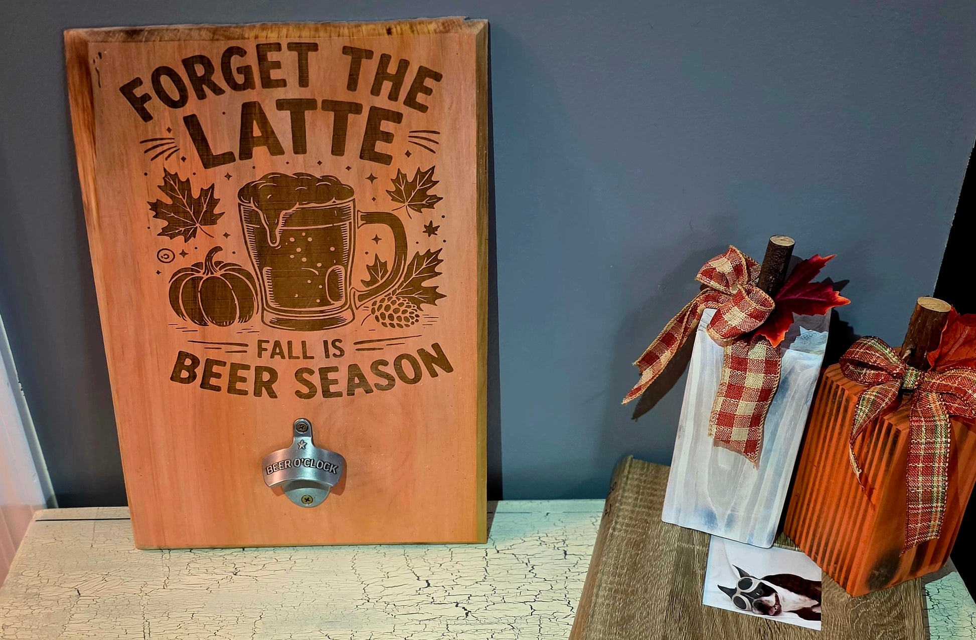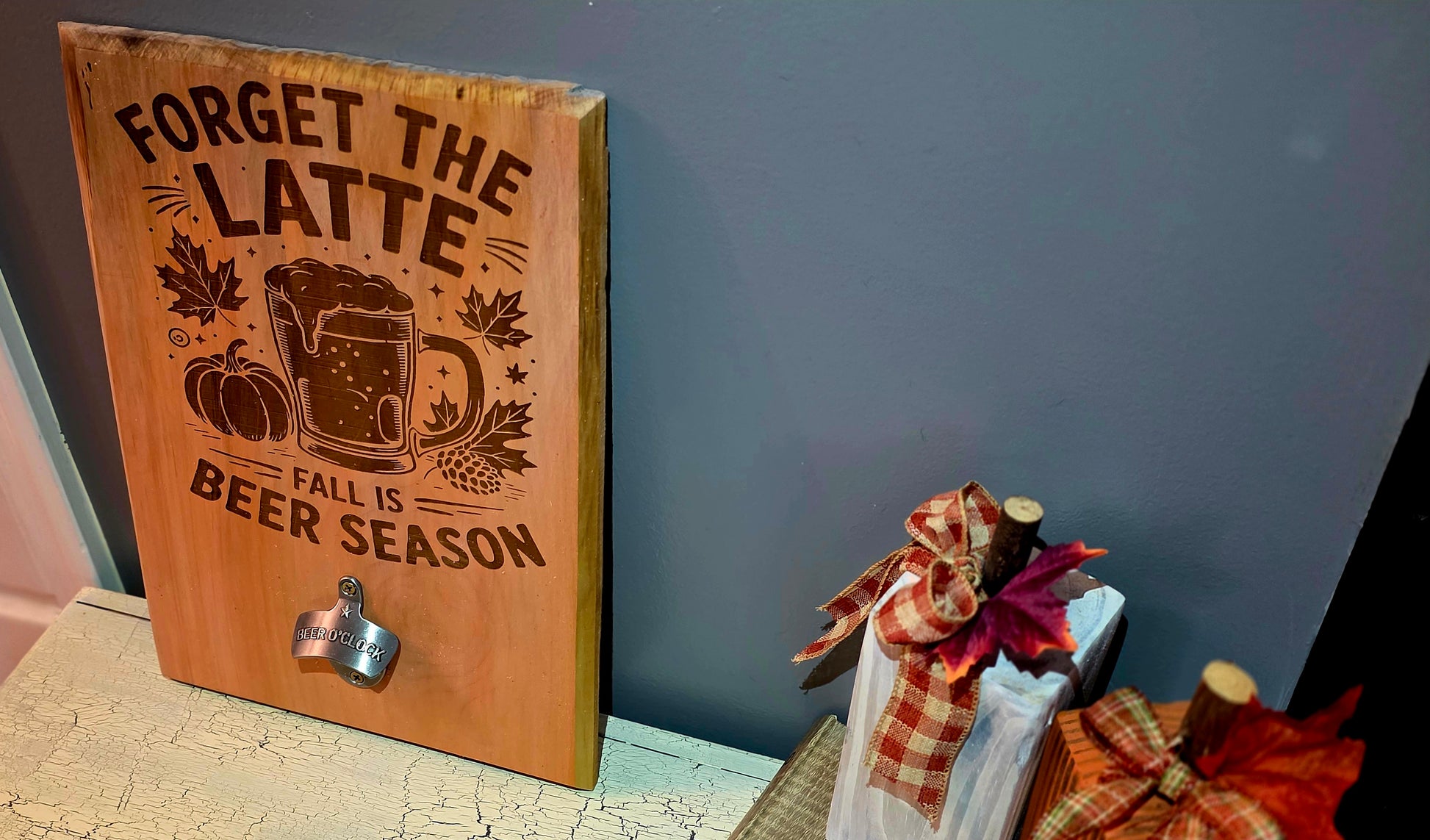 Rustic Fall Wall Hanging & Magnetic Bottle Opener! Features charming "Forget the Latte, Fall is Beer Season" design with vintage farmhouse vibes. Magnetic opener catches bottle caps for easy cleanup. Customizable colors available!