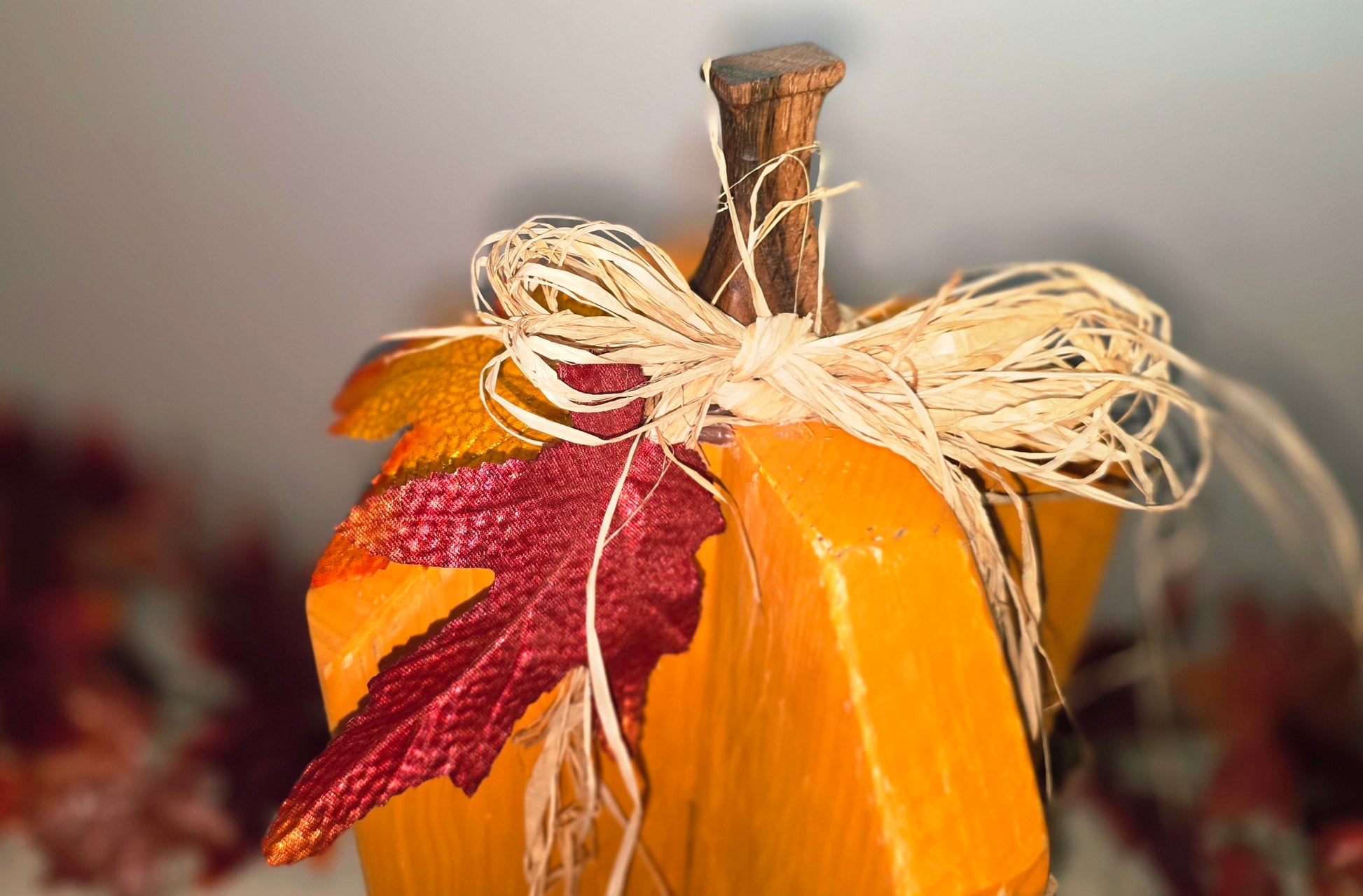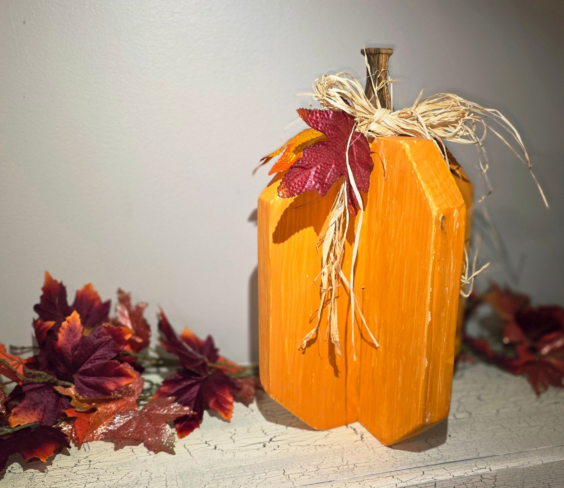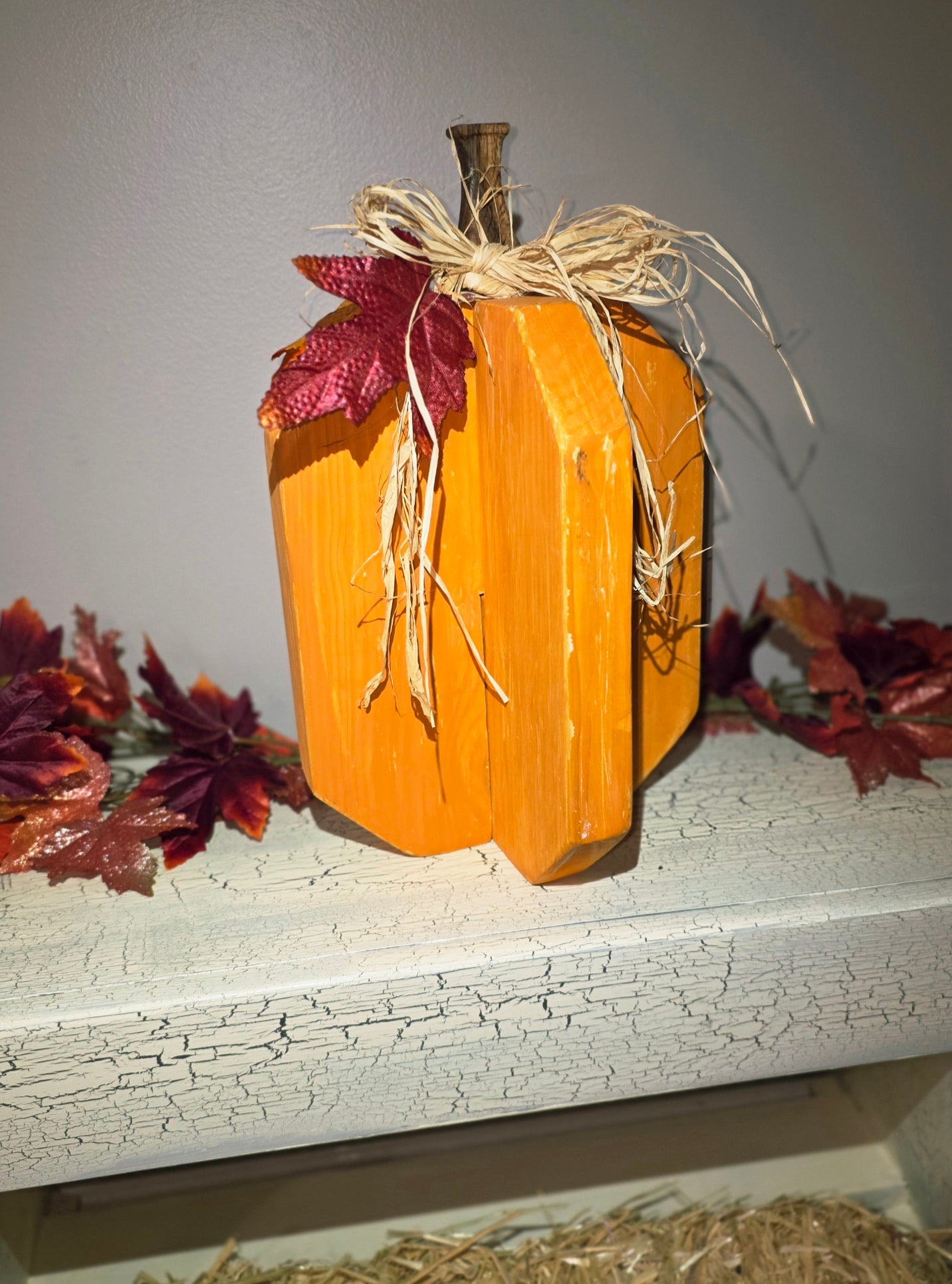 Hand crafted farm pumpkins. Distressed orange and uniquely finished with a hand carved red oak stem. 14" tall.
