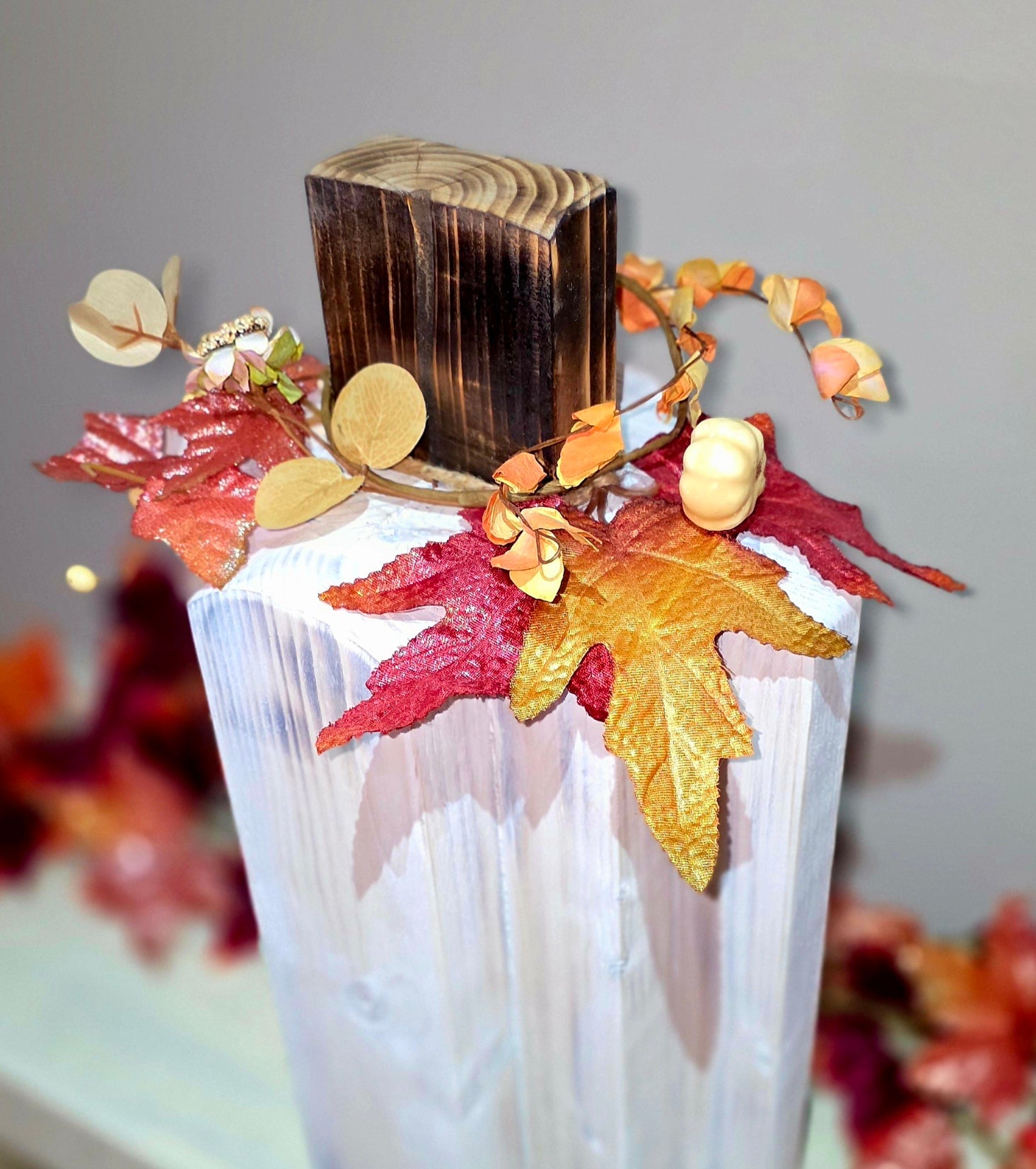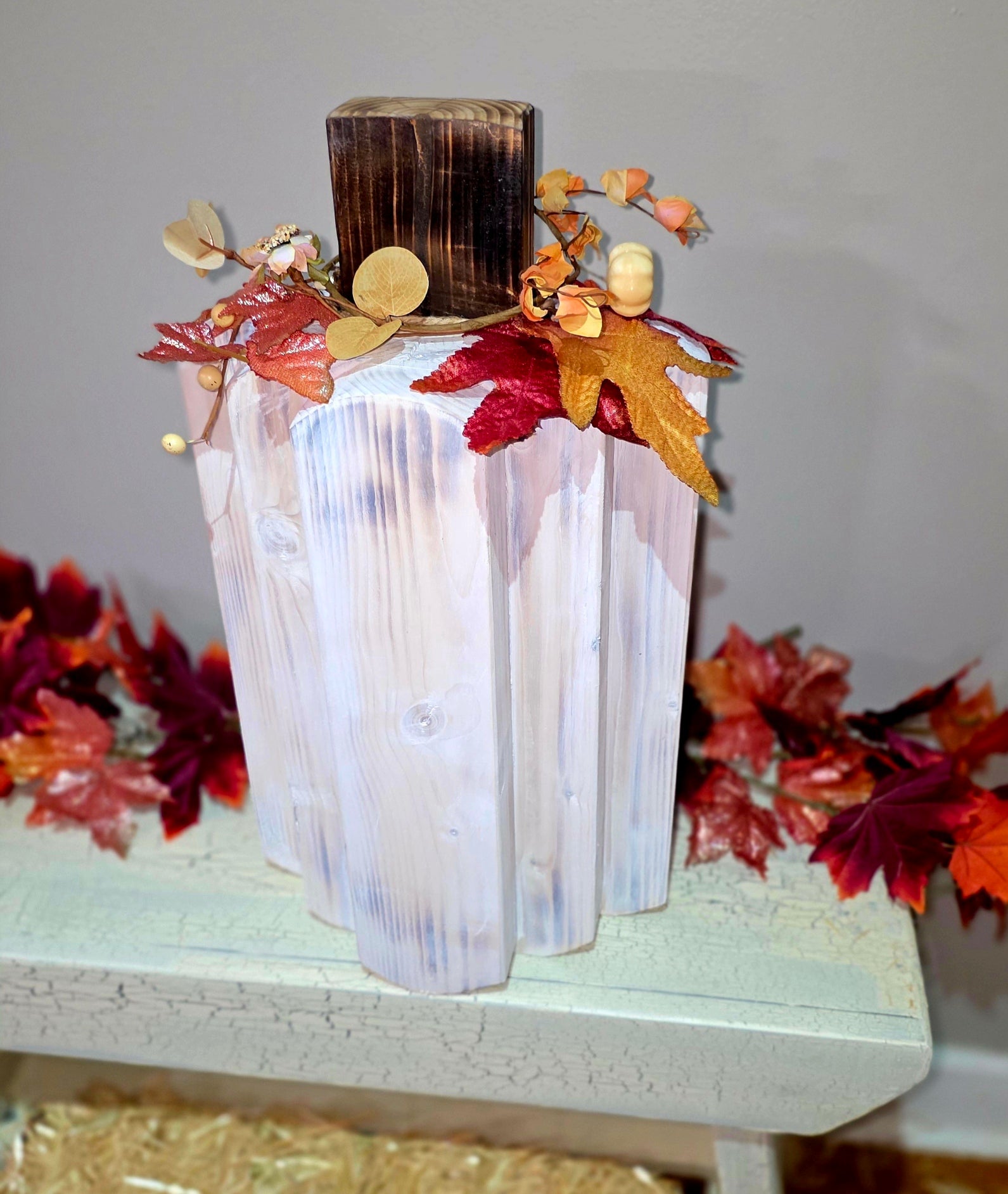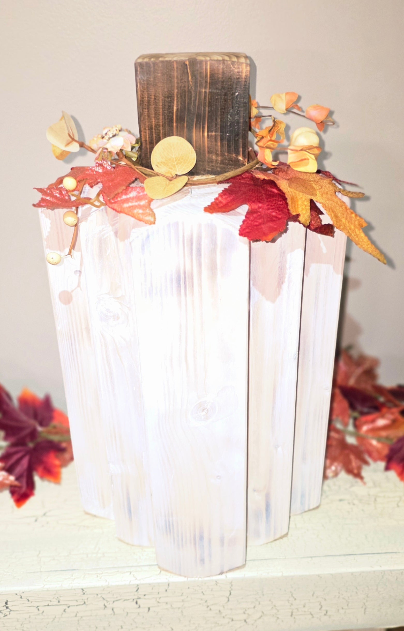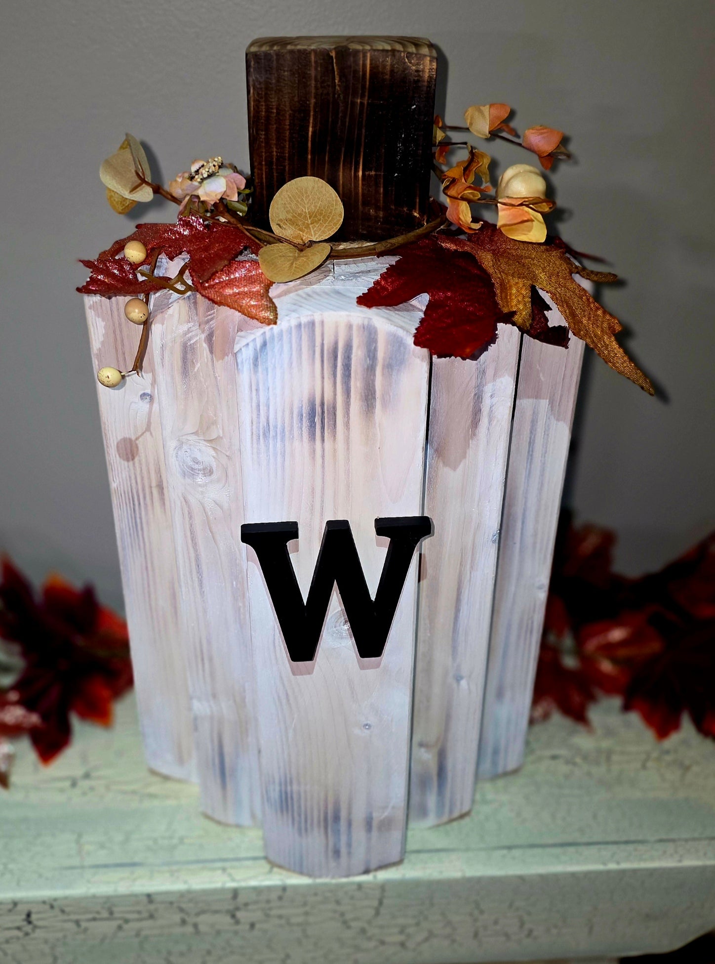 Crafted with Shou Sugi Ban and distressed finish, this large pumpkin will definitely Stand out and add rustic warmth to your fall decor.