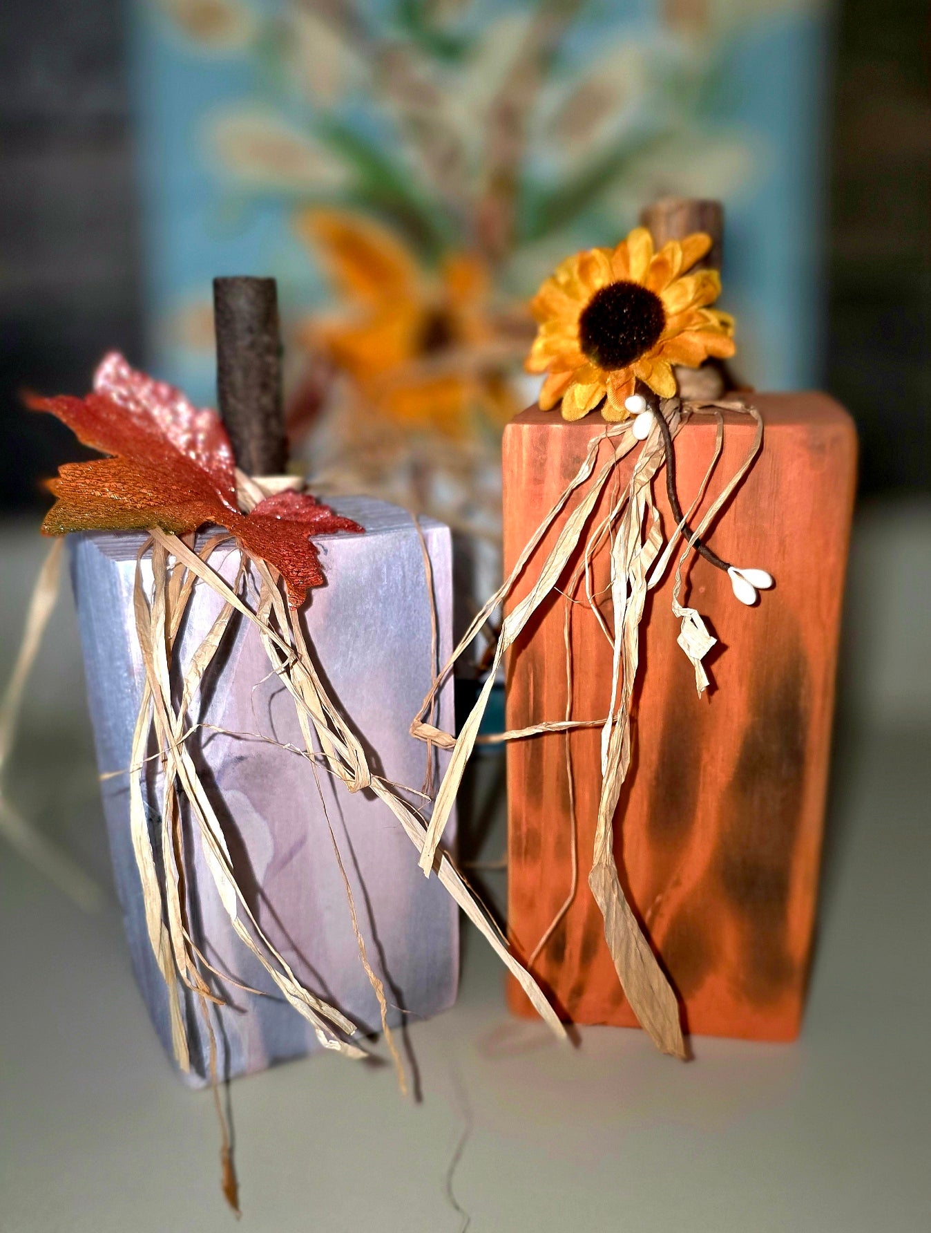 Mini rustic pumkin set. Hand crafted and distressed to give the rustic Americana look. Each set is uniquely finished. Tallest pumkin is 8".