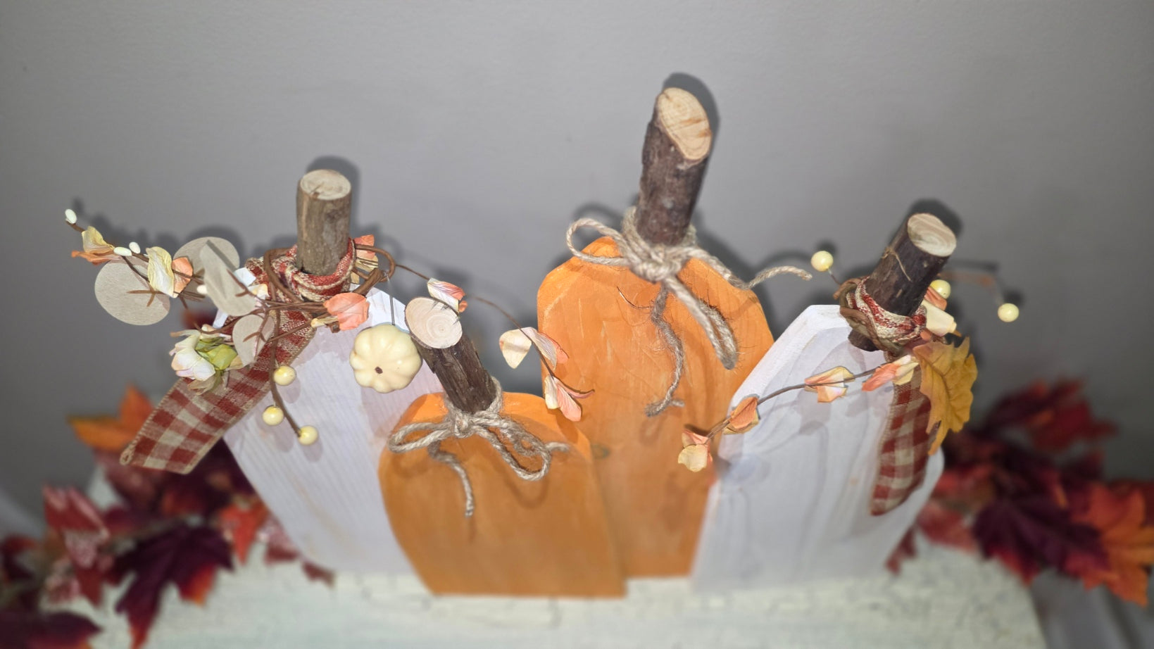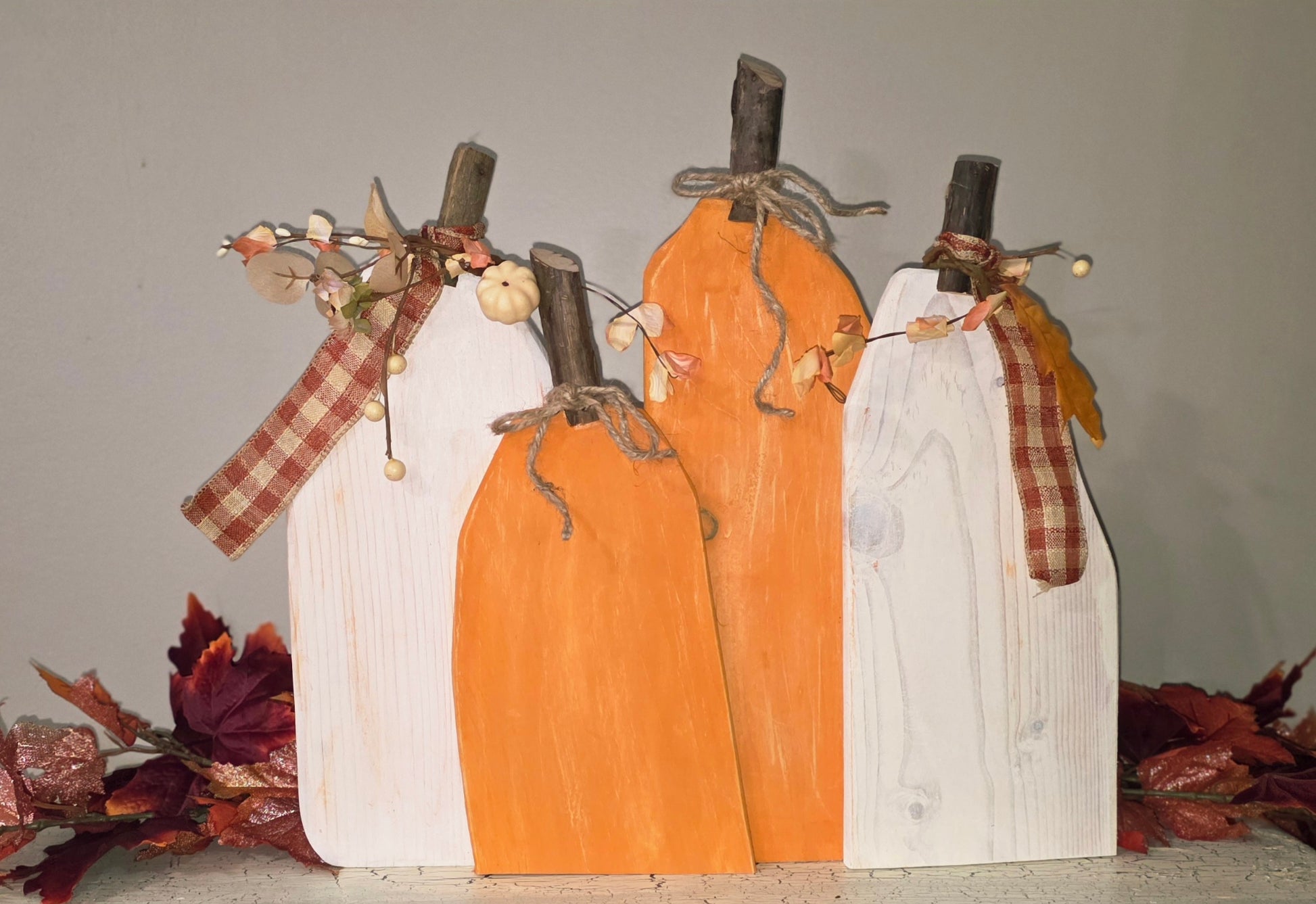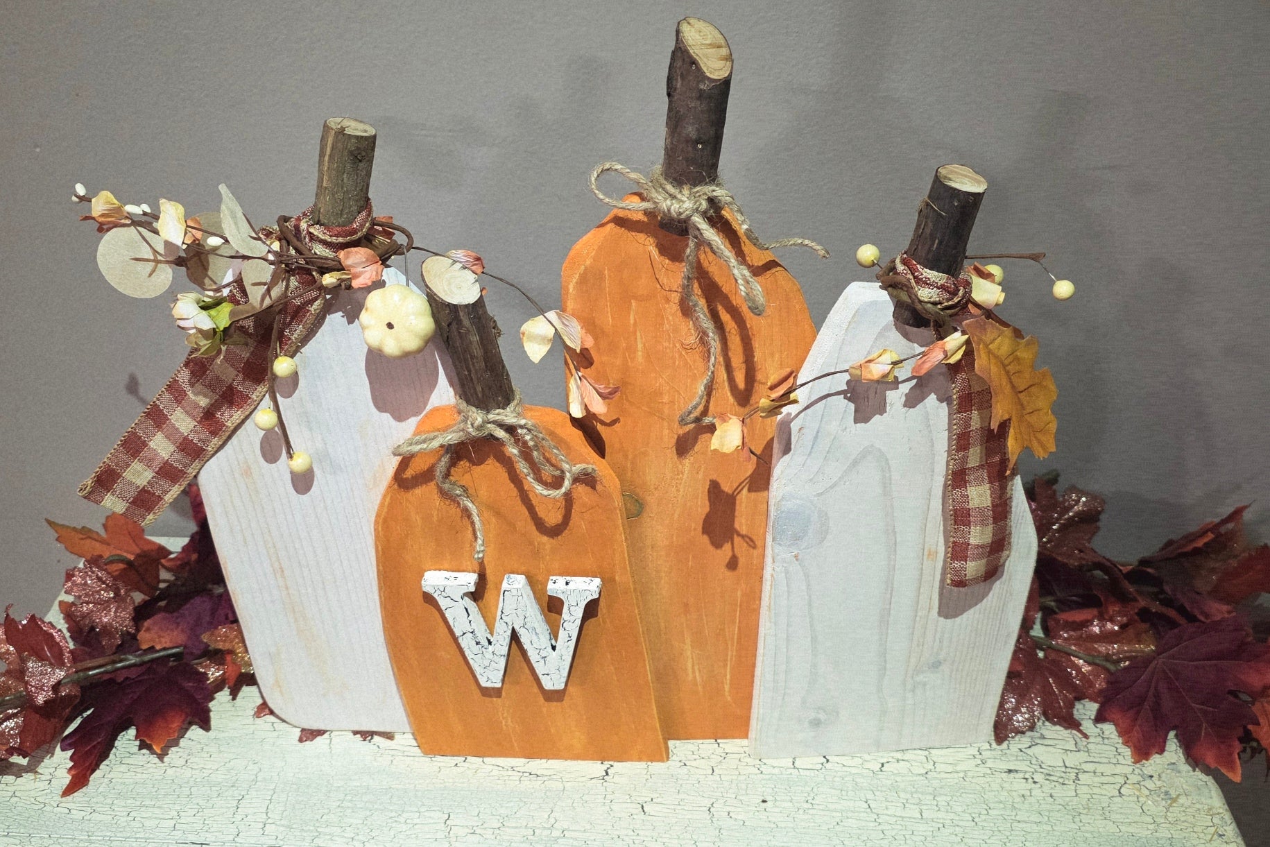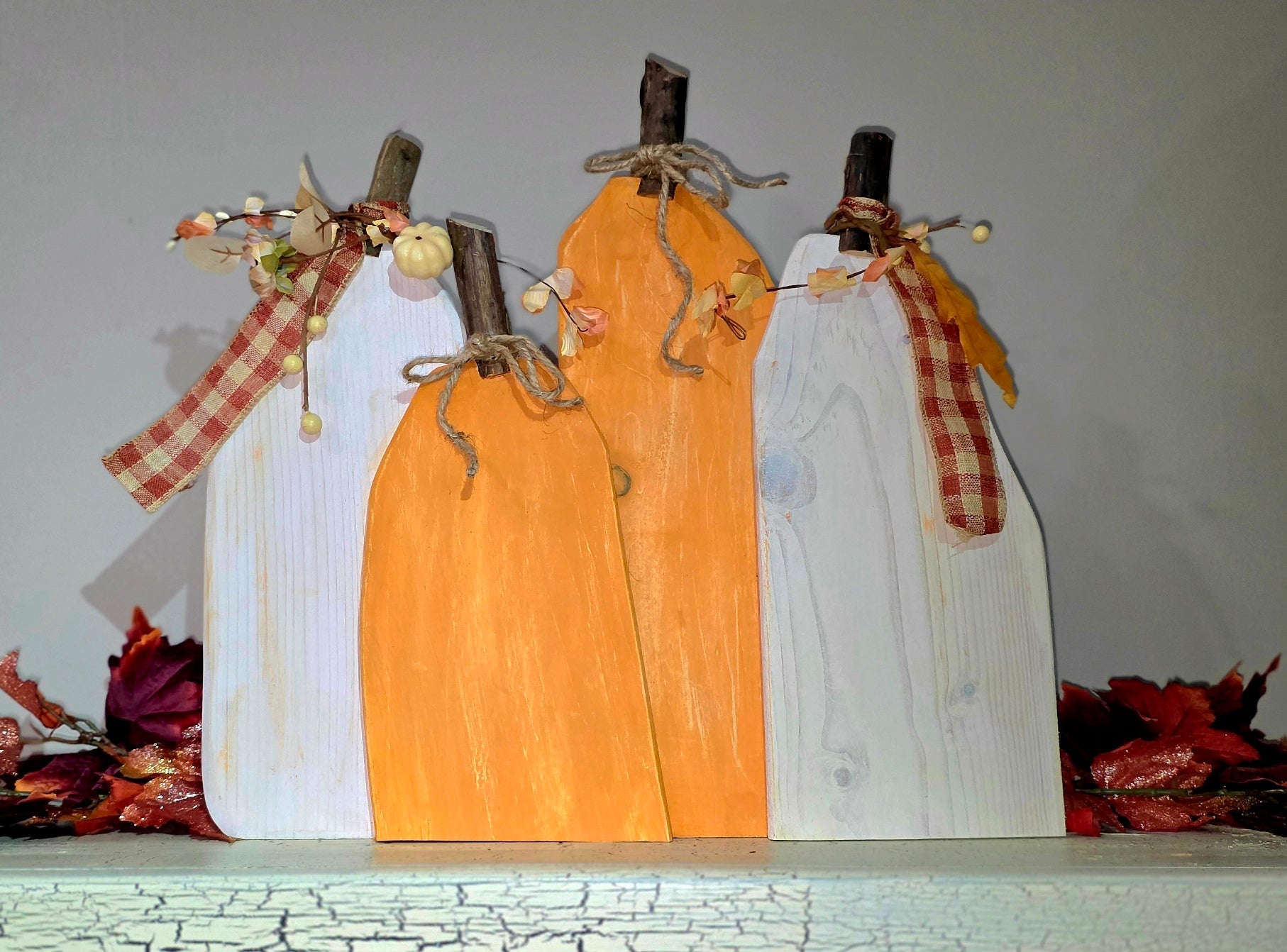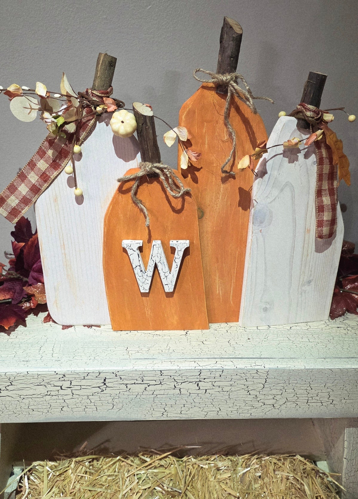 Attached free standing hand crafted pumpkins. These are rustic distressed and hand hand carved and painted. 18"x17"